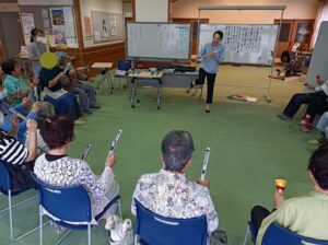皆で一緒に懐メロを歌ったり、「虫の声」の曲に合わせて普段触れることのないトーンチャイムやベルを使って演奏することで、素敵な音色が響き渡りました。曲当てゲームでは「音楽は聞いたことがあるけど曲名が出てこないわ」など、一生懸命考えてくださる姿が印象的でした。曲当てはただのゲームではなく認知症予防にもつながると言われています。今回は音楽を通して楽しく認知症予防ができました。